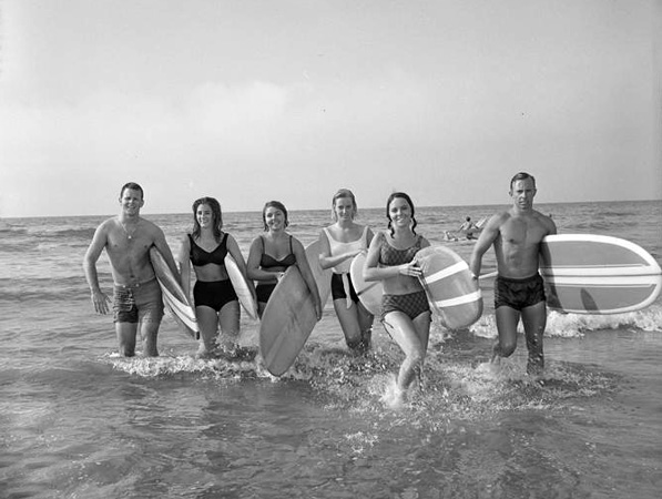 Surfer’s coming out of the water at Santa Monica Beach, 1964.