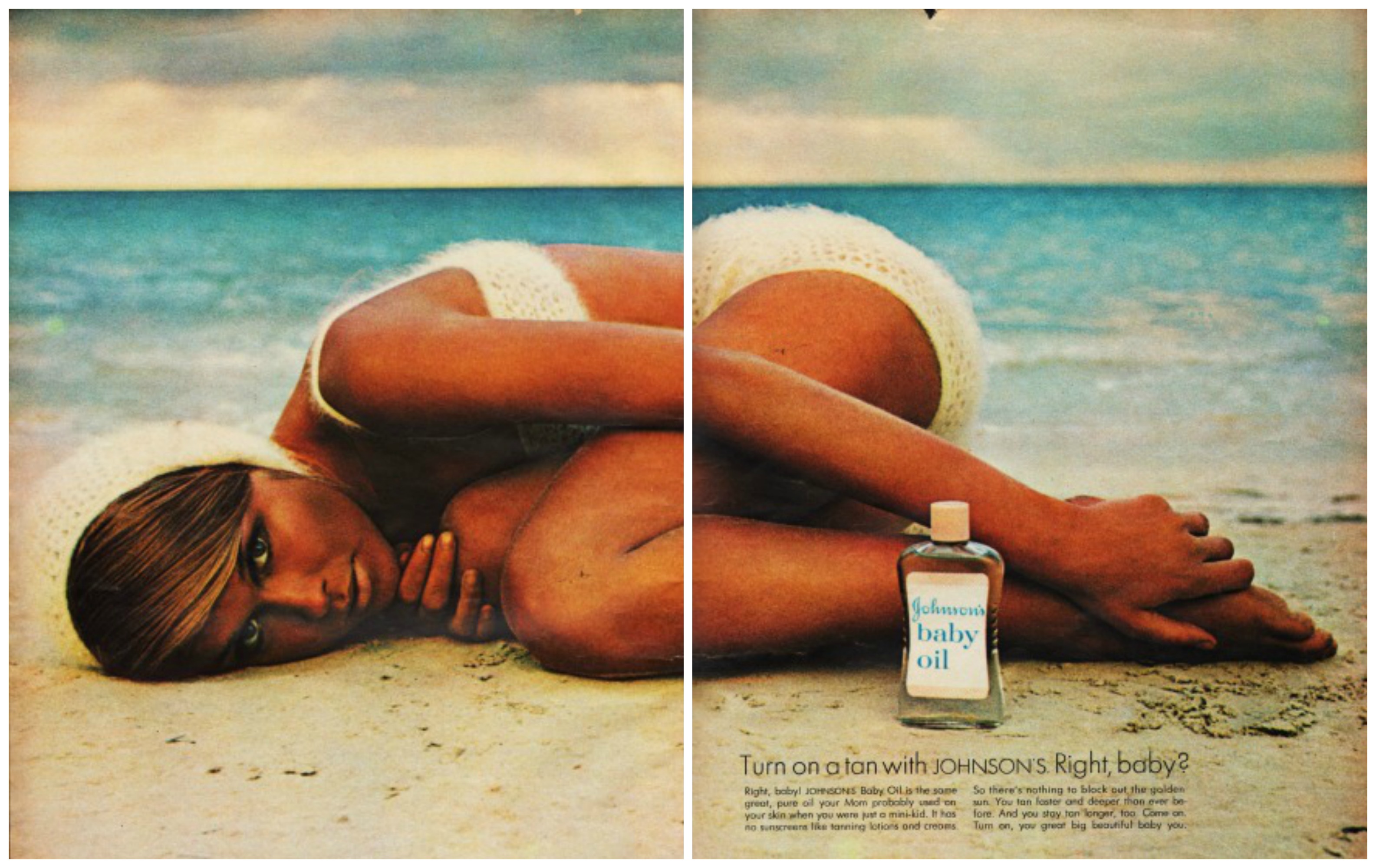 Turn on a tan with Johnson’s Baby Oil – This vintage ad from the 1960s boasts: “It has no sunscreen like tanning lotions and creams. So there’s nothing to block out the golden sun. You tan faster and deeper than ever before. And you stay tan longer. Come on. Turn on you great big beautiful baby you!” http://envisioningtheamericandream.com/2013/07/09/sizzling-in-the-sixties-suburban-sun-2/