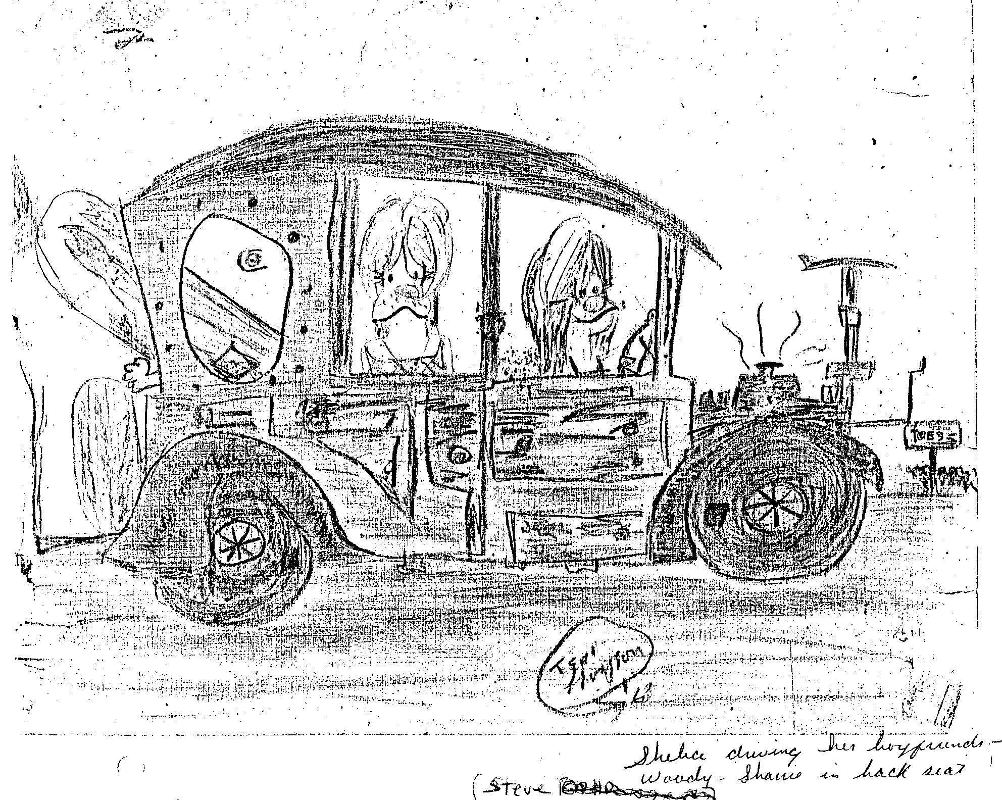 Shelia was one of my best friends. Here is a drawing done by my sister Donna’s friend Teri Thompson, of Shelia and me, in her boyfriend Steve’s Woody. Now she has a baby boy and can’t hang out with us anymore.