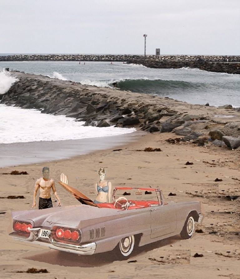My High School friend Carl Hijermind put together these two great pictures. One of me in a bathing suit and one of us at Toes, standing next to m parents cool gray 1960 T-Bird with his surfboard in the back seat. I think this captures the spirit of my 1964 Saffrons Rule Diary. (Click pictures to enlarge)