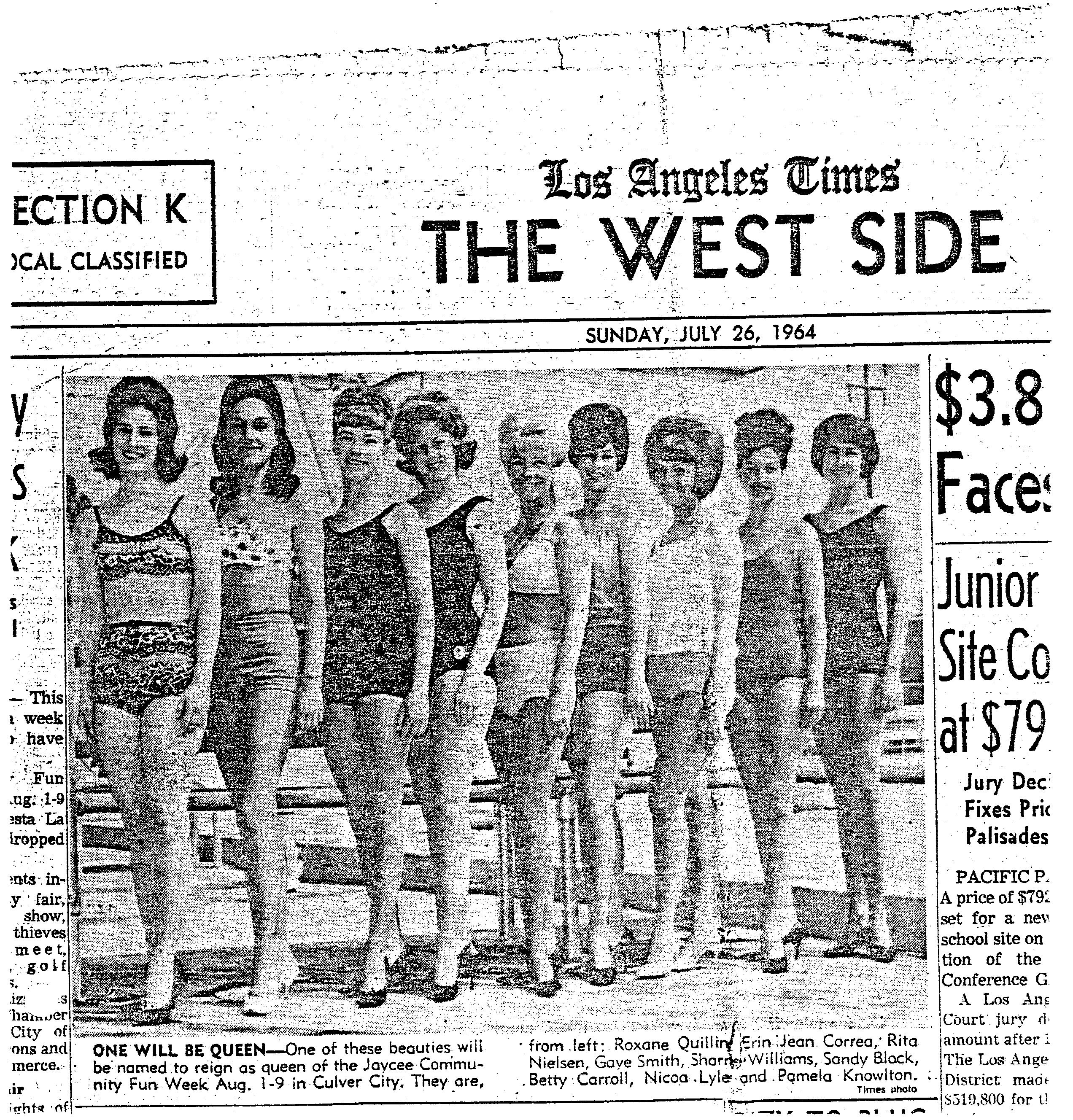 I’m the blond in the center, #5. We were only allowed to wear two piece or full piece bathing suits, not bikinis. I wore a bright yellow suit that stuck out like a sore thumb against my tan and very blond hair. Thought for sure I’d win the contest next to all the brunettes. Stay tuned to see what happens.
