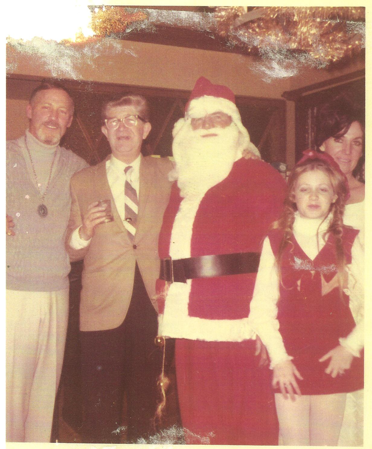 One thing I have to say about my parents parties was the music was non stop Frank Sinatra, Dean Martin and they let us play our music as well, like the Rolling Stones and the Supremes. Charlie Lewis always dressed up as Santa Claus during the Christmas party and everyone sat on his lap and got a gift out of a giant Christmas stocking. This picture was taken Christmas 1968. My dad, my parents Attorney, Vince Akin, Charlie Lewis, my mother, Pauline and my little sister Billee.